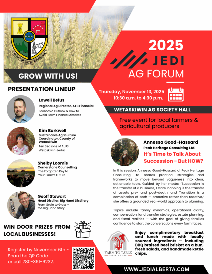 Join us for our annual Ag Forum being held on Thursday, November 13, 2025, from 10:30 a.m. to 4:30 p.m. at the Wetaskiwin Ag Society Hall. This free event includes a gourmet lunch prepared by Farm to Table Catering.